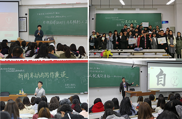 在闫蕾老师带来的《论播音员与主持人专业素养》培训课上,她围绕练声和发音方法两大部分,从“练声准备、字句练习、绕口令练习、新闻稿件、即兴评述”这五个方面提出了五点建议,从生活工作实际出发,强调了“学习能力”的重要性,生动的讲解使现场同学收益颇丰;田野老师向成员们漫谈媒介素养问题,以讲解数字移民和数字原住民为引,论述了在如今互联时代,学生如何运用好网络,让之成为自我进化的工具。田老师结合自己的工作经验以及就业趋势,畅谈新闻媒体行业应如何进行职业规划,更好地阐释了《与校园媒体同行 开启精彩人生》这个主题;欣蕾老师为大家带来的《心灵成长课——团队成长于整合技术》上,通过“静听音乐冥想、抽卡片、团队无声作画”与成员们形成互动,既让每个人了解到自己的性格特点,在团队中的角色定位,也让大家亲身体验到了一个团队之间默契的重要性;米怀飞老师从《新闻采访与写作漫谈》入手,给成员们介绍了一些采访和写作的技巧。并通过自己的工作稿件和大学生活,与大家分享了自己的成长体悟,让成员们加深了对新闻工作的理解,对如何协调工作和学习也有了更清晰的认识;在杨琨老师《从优秀到卓越》的培训课上,他以认识“自我”为由,告诫在座的同学们正确认识自我同时也应保持谦虚、孝顺、礼貌等良好品德。现场,杨琨老师还就“学生之间如何进行团队合作”这个问题与成员们进行探讨,并运用身边的例子进一步做出解释,引发了成员们的深度思考。主题系列培训结束后,校园之声广播台、大学生记者团内部还进行了相关的业务培训和素质拓展等活动,加深对培训内容理解和消化。