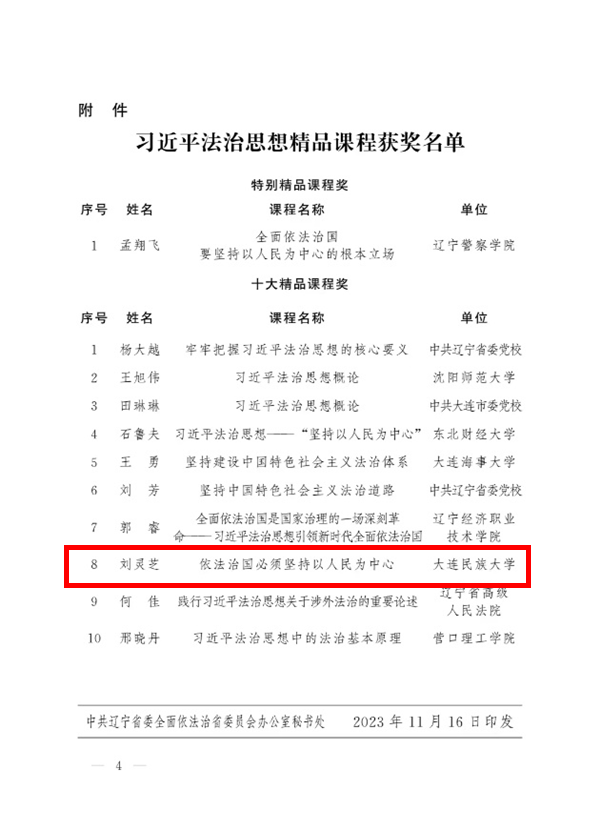 民大新闻网讯 日前,为深入学习宣传研究阐释习近平法治思想,辽宁省委依法治省办会同省委组织部、省委宣传部、省教育厅共同组织开展了习近平法治思想精品课程征集评选活动。欧冠文法学院刘灵芝教授申报的课程荣获“十大精品课程奖”。