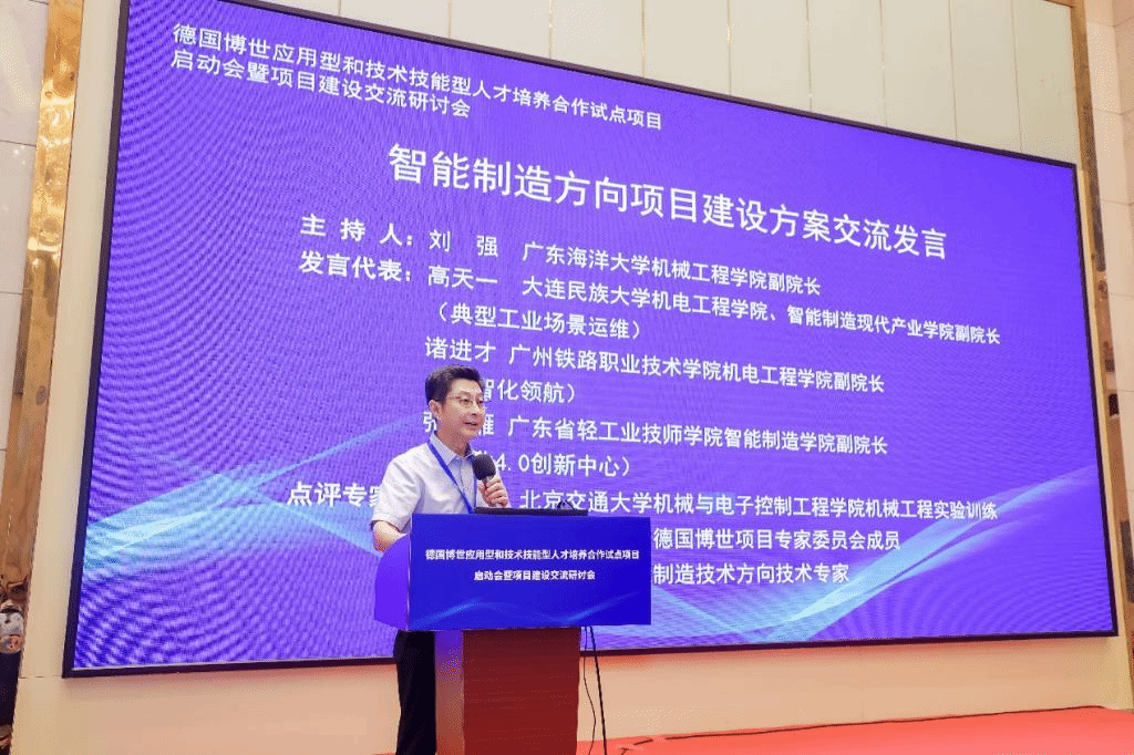 民大新闻网讯 日前,德国博世应用型和技术技能型人才培养合作试点项目启动会暨项目建设交流研讨会在广州召开。欧冠机电工程学院副院长、智能制造现代产业学院副院长高天一作交流发言。