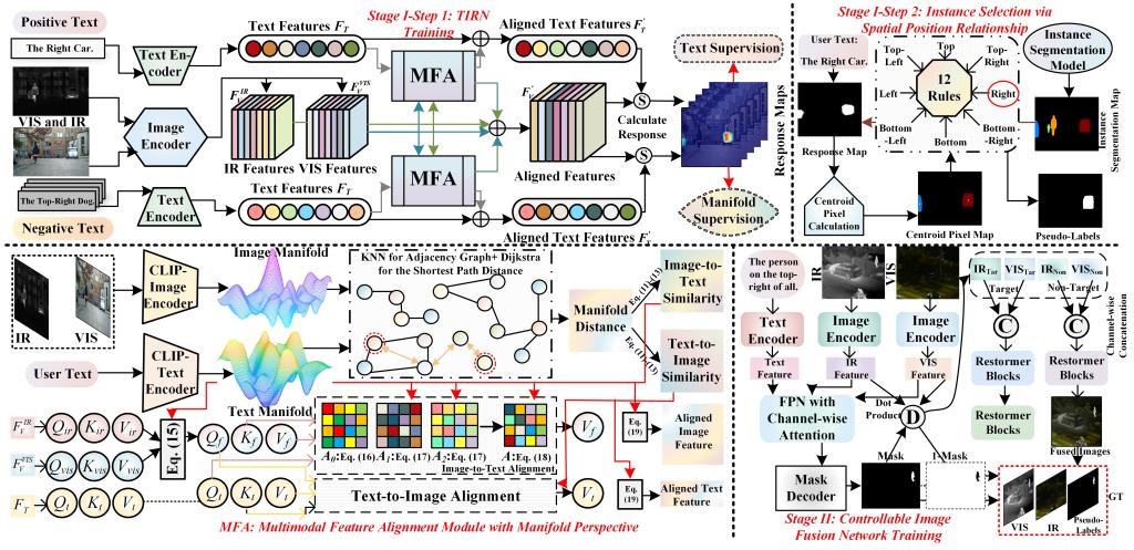 在计算机视觉领域中多源图像融合研究上,王泽宇针对现有红外与可见光图像融合方法缺乏可控性、难以满足用户个性化需求问题,提出一种弱监督、实例级可控的融合模型,可依据输入文本自适应地突出用户关注的目标。模型包含两个阶段:第一阶段通过多模态流形先验,引导文本响应网络从实例分割结果中识别与文本匹配的目标对象,生成伪标签;第二阶段利用伪标签指导融合网络对目标与非目标区域采用差异化策略。实验表明,该方法在融合质量和可控性方面表现出色,并在下游任务中取得优异效果。