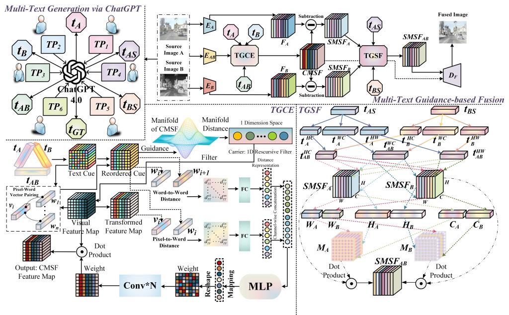 在多模态图像融合研究上,针对现有图像融合算法难以准确分解多模态特征以及标签图像缺失的问题,王泽宇提出一种基于多文本引导的模型。该模型充分发挥大型视觉语言模型的优势,为输入图像生成定制化文本描述,为上述挑战提供全新解决思路。核心创新为文本引导的共/异性特征提取器,通过流形等势域变换技术将视觉特征转换至文本域,并基于文本-视觉和文本-文本双重距离实现高效的视觉-文本交互。此外,所提算法使用视觉-语言大模型生成文本标签,以训练图像融合网络。实验表明,该方法在红外-可见光图像融合和医学图像融合两个任务上实现了优异性能。