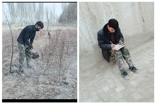 开始上网课之后,克热木就和还在读高中的妹妹一起用流量听网课。为了减轻流量听课给贫困学生带来的家庭负担,学校专门提供了家庭困难补助和网络流量使用补助。有时候早晨起来看直播时网络会中断,课多的时候还会遇到限速的情况。外面的信号比屋子里更好,克热木就带着手机坐在墙边听课,然后再趁着中午或者下午网络通畅的时候抓紧完成作业。新疆的早春寒风凛凛,克热木从来没有抱怨过一次。
