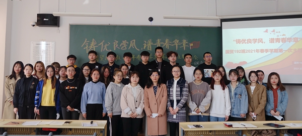 2021年春季学期,国贸192班“学党史、强信念、跟党走”第一次主题班会作为国际商学院模范班会展现给学校老师们,班会无论从内容还是形式上,均得到老师们的一致认可。班委对每一次班会都认真地准备,把“要么不开班会,要么就做到极致”作为目标。班级里的每名同学,积极踊跃地发言,对班会内容进行学习并分享自己的感悟,在每一次班会中都有所收获、有所成长。