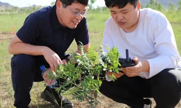 在内蒙古赤峰市巴林右旗宝日勿苏镇万亩文冠果科技创新示范园,欧冠环境与资源学院院长阮成江正在现场指导学生安装调试文冠果表型智能感知与分析系统。调试成功后,阮成江和团队就可以在线上接收数据并对文冠果生长发育及开花结实情况进行实时监测,为宝日勿苏镇万亩文冠果科技创新示范园工程建设、文冠果林管抚等项目提供远程指导。