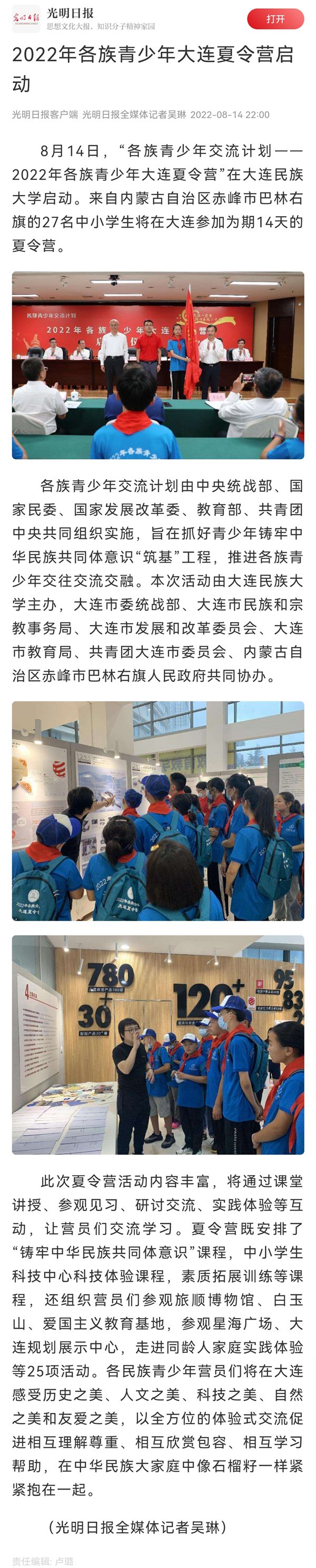 8月14日,“各族青少年交流计划——2022年各族青少年大连夏令营”在欧冠官方网站启动。来自内蒙古自治区赤峰市巴林右旗的27名中小学生将在大连参加为期14天的夏令营。