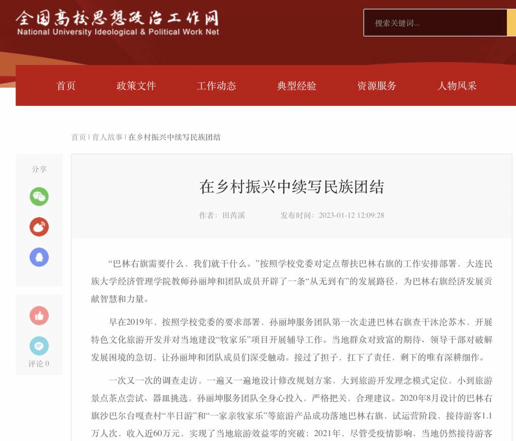 为了帮助更多民族地区在乡村振兴中探索出特色发展之路,孙丽坤将在苏木地区的项目实践编写进独著出版的学术著作《民族地区文化创意旅游业理论与实证研究》一书中。她把项目成果整理为学术论文,并在中国民族旅游论坛上作了学术报告,学术论文被收录在会议论文集中。