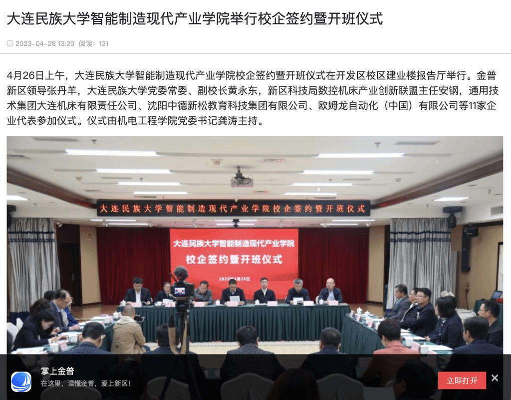 4月26日上午,欧冠官方网站智能制造现代产业学院校企签约暨开班仪式在开发区校区建业楼报告厅举行。金普新区领导张丹羊,欧冠官方网站党委常委、副校长黄永东,新区科技局数控机床产业创新联盟主任安钢,通用技术集团大连机床有限责任公司、沈阳中德新松教育科技集团有限公司、欧姆龙自动化(中国)有限公司等11家企业代表参加仪式。仪式由机电工程学院党委书记龚涛主持。