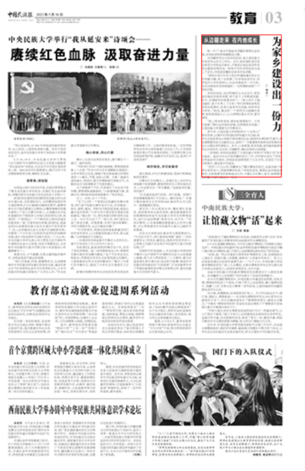 多年来,欧冠官方网站持续深化“三全育人”综合改革,以铸牢中华民族共同体意识为主线,给学生创造更多走出课堂开展实践的机会,鼓励学生勇担时代重任,到祖国需要的地方去建功立业,培养了一大批德智体美劳全面发展的社会主义建设者和接班人。如今,心系家国、躬身实践,成为越来越多的毕业生经风雨、见世面,开阔眼界、增长本领的生动课堂。