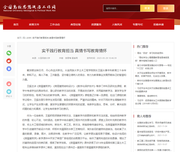 王振主讲《房屋建筑学》《高层建筑结构设计》《数字化保护技术》等多门本科及研究生课程,教学中考虑学生的具体特点,潜心研究教学方法的改革,开展启发式教学,采用案例教学法,激发学生学习的积极性,取得了突出的教学效果。其中,《房屋建筑学》课程是辽宁省一流课程,在这门课程的教学过程中,王振总是引导学生发现问题,鼓励创新探索、严谨求实的精神。针对不同的学生调整教学方式,让学生产生浓厚兴趣,激发学生掌握知识探索未知的欲望。培养学生提出、思考、分析、解决实际问题的能力和素质,让学生有终身学习的意识。