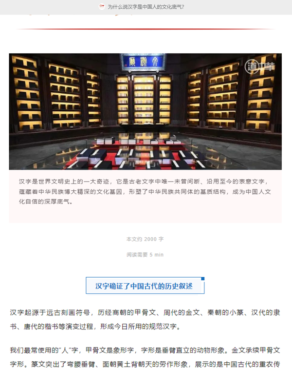 汉字是世界文明史上的一大奇迹,它是古老文字中唯一未曾间断、沿用至今的表意文字,蕴藏着中华民族博大精深的文化基因,形塑了中华民族共同体的基质结构,成为中国人文化自信的深厚底气。