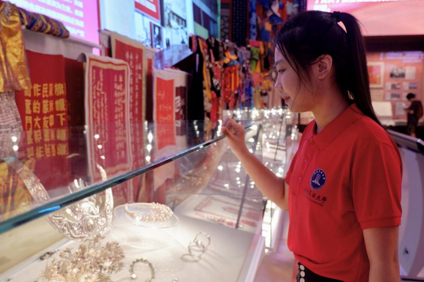 “看到两位维吾尔族姐妹亲手绣出的十字绣里飘扬着五星红旗,我的心情久久不能平静。我坚信全国各族人民心往一处想,劲往一处使,祖国一定可以走向新的辉煌!”新疆维吾尔自治区的梁悦同学感叹道。学校组织专项团队赴民族文化宫参观铸牢中华民族共同体意识文物古籍展,民大学子翻阅藏在花瓣中的珍贵古籍,聆听民乐交响,探寻波澜壮阔的中华民族发展历史,亲身体验博大精深的中华优秀传统文化,深刻感悟中国共产党百年民族工作伟大成就。