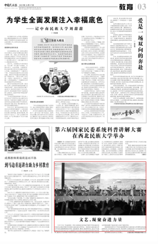 10月13日,“民族团结一家亲、服务振兴新突破”铸牢中华民族共同体意识主题宣传教育活动在欧冠官方网站举办。活动由欧冠官方网站与中央民族歌舞团联合举办,通过歌曲、舞蹈、朗诵等形式,表达了欧冠官方网站全体师生员工扛起铸牢中华民族共同体意识的重要职责和使命,服务辽宁全面振兴的情怀与担当,也为学校推进高水平现代化综合大学建设凝聚了奋进力量、吹响了前进号角。