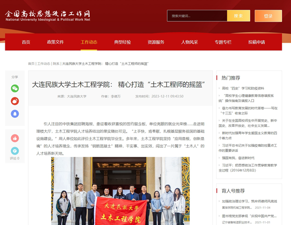 “多年来,学院坚持以铸牢中华民族共同体意识为主线,逐步形成了具有学院特色的‘钢筋混凝土’精神,具体内容为‘敢于负责、勇挑重担的担当精神,甘于奉献、团结协作的团队精神,不屈不挠、自强不息的民族精神’。这种精神借喻了钢筋混凝土结构的优良性能,体现了学院专业以及行业的特点,能够进一步推动铸牢中华民族共同体意识扎根学生内心,更符合学院师生长期形成的优良作风。土木学子在学院精神的激励和指引下,成长为铸牢中华民族共同体意识的坚定践行者,成长为有担当、善协作、有骨气的新时代土木工程师。”学院院长王振说。