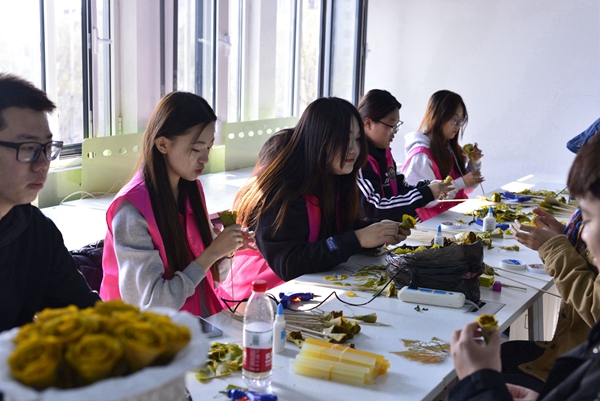“接到用落叶做创业设计这个消息之后,我们都很兴奋,大家聚在一起讨论,上网查找参考作品,在‘头脑风暴’中,一个又一个新奇的点子不断地冒出来。”建筑学213班韩童绯说。收集挑选树叶、压制剪裁、粘贴造型……为了展示最好的创意,学生们以寝室、工作室为单位,自由组队,发挥所长,挑灯夜战赶制作品,在互帮互助互学过程中,激发创新意识、提升动手能力和协作能力,促进各民族学子交往交流交融。