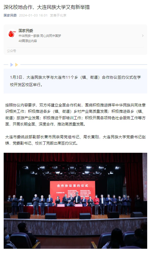 赵铸表示,国家民委高度重视学校与地方开展校地合作,此次签约是继学校与辽宁省民宗委和大连市民宗局、与省内8个民族自治县合作协议签约仪式成功举行后,学校深化校地合作的又一次重要活动。学校将以签约仪式作为校地合作新起点,全面深化与各乡(镇、街道)合作,加强资源共享、优势互补、互利共赢,最大限度调集和动员全校优势力量,在铸牢中华民族共同体意识、科技创新、特色农业及文旅产业发展、干部培训、党的建设等方面形成更多成果,在携手服务辽宁全面振兴新突破三年行动和大连“两先区”“三个中心”高质量发展中实现共谋发展、合作共赢。
