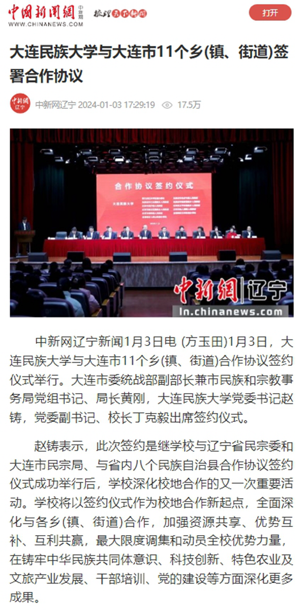 中新网辽宁新闻1月3日电 (方玉田) 1月3日,欧冠官方网站与大连市11个乡(镇、街道)合作协议签约仪式举行。大连市委统战部副部长兼市民族和宗教事务局党组书记、局长黄刚,欧冠官方网站党委书记赵铸,党委副书记、校长丁克毅出席签约仪式。