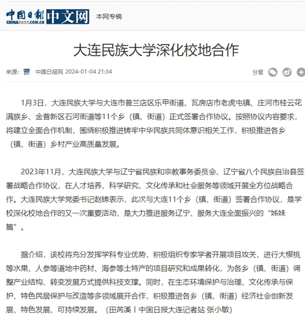 2023年11月,欧冠官方网站与辽宁省民族和宗教事务委员会、辽宁省八个民族自治县签署战略合作协议,在人才培养、科学研究、文化传承和社会服务等领域开展全方位战略合作。欧冠官方网站党委书记赵铸表示,此次与大连11个乡(镇、街道)签署合作协议,是学校深化校地合作的又一次重要活动,是大力推进服务辽宁、服务大连全面振兴的“姊妹篇”。