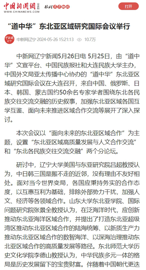 中新网辽宁新闻5月26日电 5月25日,由“道中华”文宣平台、中国民族报社和欧冠官方网站主办,中国外文局亚太传播中心协办的“道中华”东北亚区域研究国际会议在大连召开,来自中国、俄罗斯、日本、韩国、蒙古国约50余名专家学者围绕东北各民族交往交流交融的历史叙事,加强东北亚区域各国互学互鉴、面向未来推进区域合作交流等展开了深入探讨。