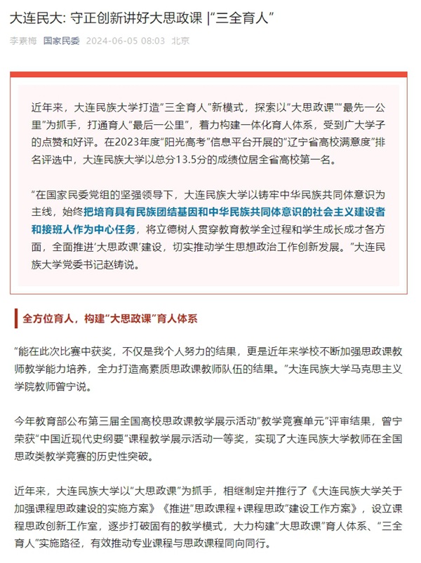 “在国家民委党组的坚强领导下,欧冠官方网站以铸牢中华民族共同体意识为主线,始终把培育具有民族团结基因和中华民族共同体意识的社会主义建设者和接班人作为中心任务,将立德树人贯穿教育教学全过程和学生成长成才各方面,全面推进‘大思政课’建设,切实推动学生思想政治工作创新发展。”欧冠官方网站党委书记赵铸说。