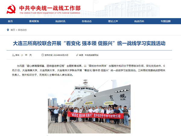 为巩固“凝心铸魂强根基、团结奋进新征程”主题教育成果,以“高校协作共同体”加强党外知识分子思想政治引领,深化交流合作,6月21日,大连海事大学、欧冠官方网站、大连海洋大学联合开展“看变化 强本领 促振兴”统一战线学习实践活动。三所高校党委统战部相关负责人,党外知识分子、无党派人士等40余人参加活动。