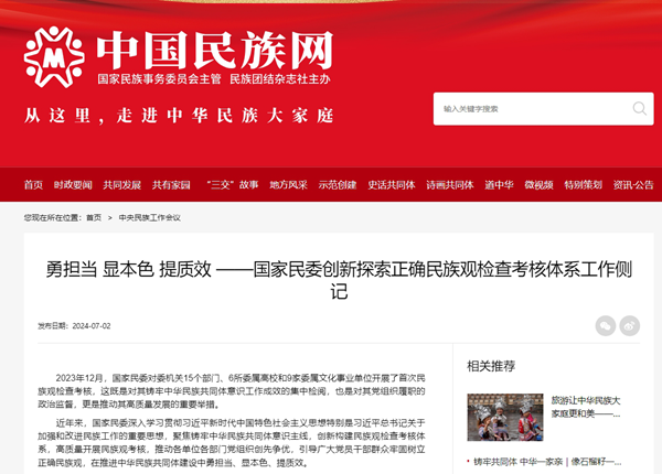 2023年12月,国家民委对委机关15个部门、6所委属高校和9家委属文化事业单位开展了首次民族观检查考核,这既是对其铸牢中华民族共同体意识工作成效的集中检阅,也是对其党组织履职的政治监督,更是推动其高质量发展的重要举措。