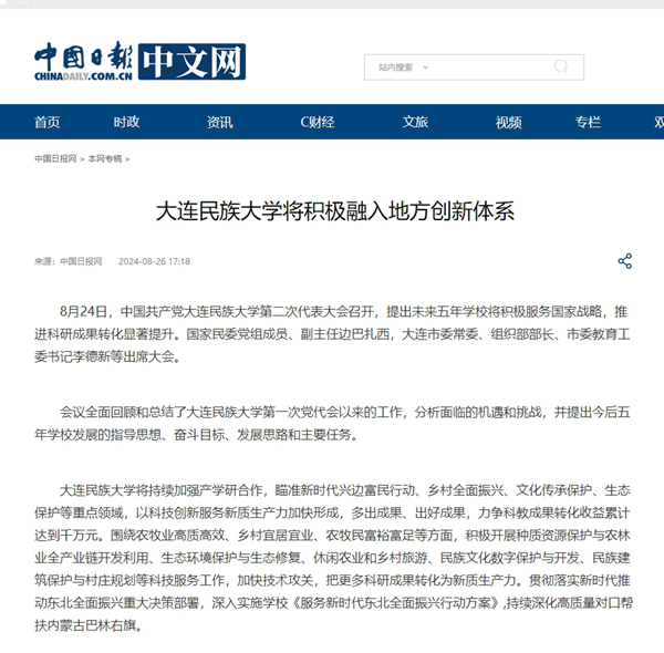 同时,学校将全面加强与辽宁省市统战、民族工作部门的联系合作,持续将服务辽宁省8个民族自治县、大连市 11个乡(镇、街道)、大连金普新区作为重点领域,抓实校地合作具体项目落地,继续推进与大连金普新区“校地合作示范区”建设,推进共建数字经济产业研究院等重点项目建设,积极融入地方创新体系,大力对接地方产业集群、战略性新兴产业发展。加强大学科技园区工作,建好各地科研工作站,探索校地、校企合作新模式。(田芮溪丨中国日报大连记者站 张小敏)