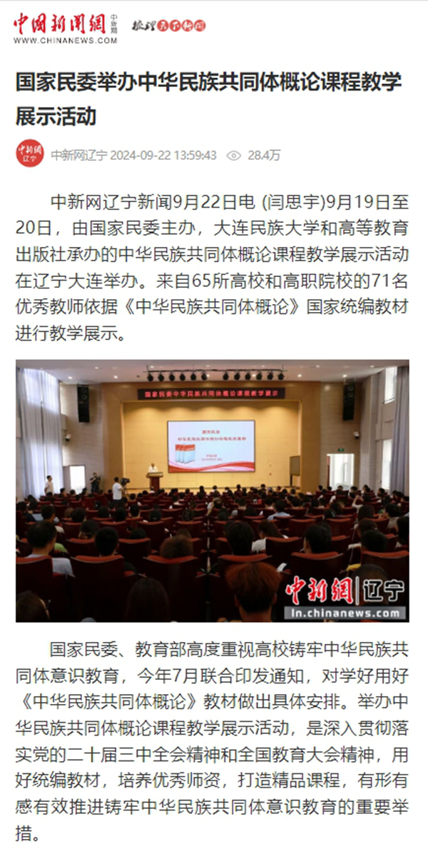 国家民委、教育部高度重视高校铸牢中华民族共同体意识教育,今年7月联合印发通知,对学好用好《中华民族共同体概论》教材做出具体安排。举办中华民族共同体概论课程教学展示活动,是深入贯彻落实党的二十届三中全会精神和全国教育大会精神,用好统编教材,培养优秀师资,打造精品课程,有形有感有效推进铸牢中华民族共同体意识教育的重要举措。