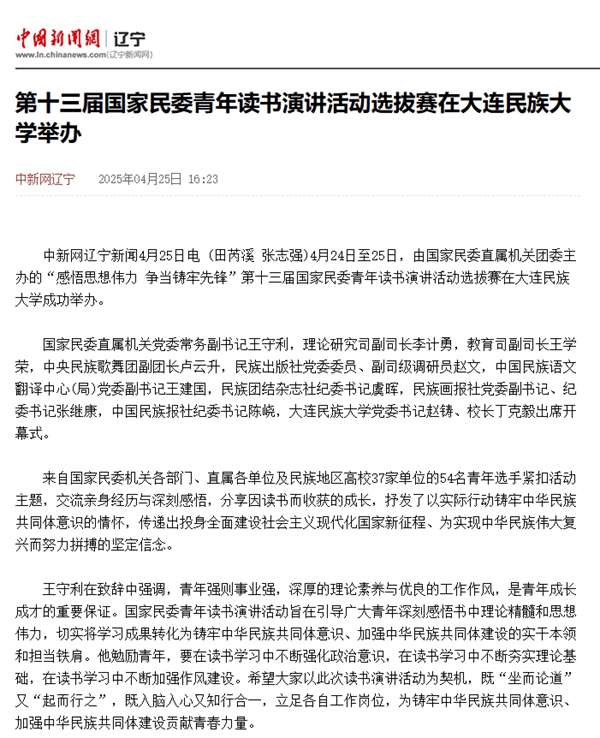 中新网辽宁新闻4月25日电 (田芮溪 张志强) 4月24日至25日,由国家民委直属机关团委主办的“感悟思想伟力 争当铸牢先锋”第十三届国家民委青年读书演讲活动选拔赛在欧冠官方网站成功举办。