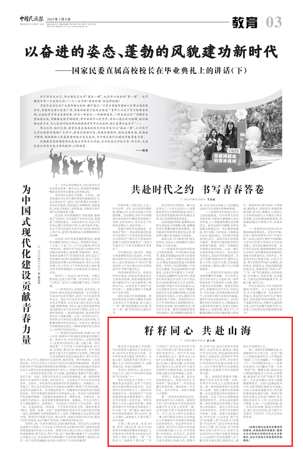 第二,希望你们把勤学不辍、精进不休作为终身习惯。当前,世界百年未有之大变局加速演进,新一轮科技革命和产业变革深入发展,国际力量对比深刻调整,社会思想观念和价值取向日趋活跃。在这个知识以指数级速度更新的时代,没有永远的避风港,唯有持续进化的思维才是安身立命的锚点。别让大学毕业成为求知的终点,学校并非承载知识的唯一宝盒。希望大家准确识变、科学应变、主动求变,勇于走出“舒适圈”,把“学在民大”拓展到“学在终身”,把在学校里养成的学习习惯、学习自觉、学习热情转化为持久的学习力,在碎片化信息的冲击中提升深度思考的能力,永远保持“认知饥饿感”,在不断求索中遇见更辽阔的自己,拥抱永不设限的人生。