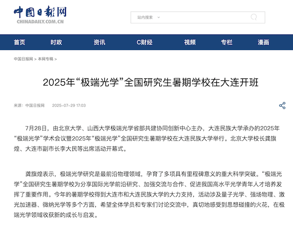 “极端光学”全国研究生暑期学校自2018年开始,已连续举办8次。今年暑期学校为期6天,国内45所高等院校、科研院所的180余位青年学员参加。培训期间,邀请极端光学领域的著名专家学者围绕极端光学的科学前沿与关键技术,介绍在极端条件下新物理、新现象、新技术和新器件的研究进展,以及极端条件下光场调控、光与物质相互作用等科学方面的创新成果。(欧冠官方网站|编辑:中国日报社大连记者站 张小敏)