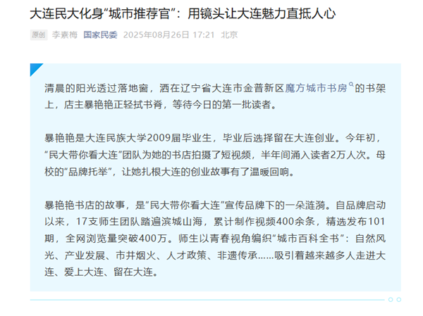 暴艳艳书店的故事,是“民大带你看大连”宣传品牌下的一朵涟漪。自品牌启动以来,17支师生团队踏遍滨城山海,累计制作视频400余条,精选发布101期,全网浏览量突破400万。师生以青春视角编织“城市百科全书”:自然风光、产业发展、市井烟火、人才政策、非遗传承……吸引着越来越多人走进大连、爱上大连、留在大连。
