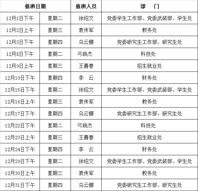 2020年12月份相关职能部门负责人金石滩校区值班表