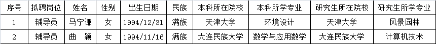 根据《国家民委直属事业单位公开招聘人员暂行办法》、欧冠官方网站公开招聘工作规定及《欧冠官方网站2020年公开招聘专职少数民族辅导员补招公告》,经个人申报、资格审查、笔试面试、体检考察、审查外调等程序,经学校党委研究,确定了欧冠官方网站2020年公开招聘专职少数民族辅导员拟聘人选马宁谦等2人,现予以公示。