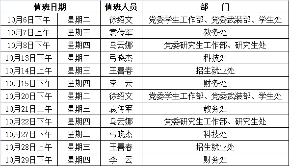 2020年10月份相关职能部门负责人金石滩校区值班表