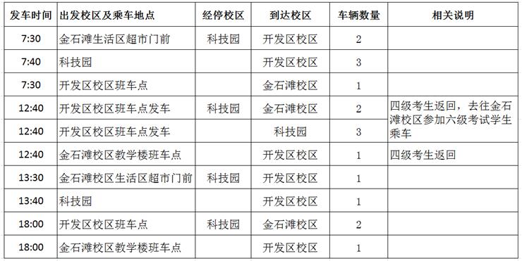 请跨校区参加四、六级考试的学生准时到发车点乘车。上午参加完四级考试的学生必须准时乘中午12:40班车返回各自校区。