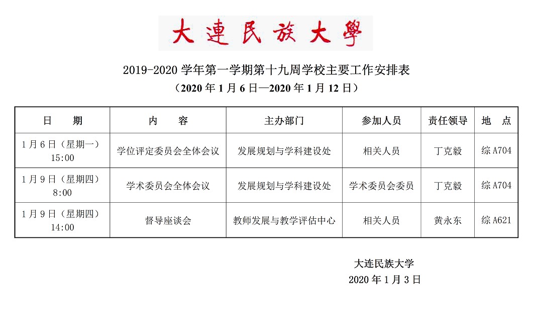 2019-2020学年第一学期第十九周学校主要工作安排表