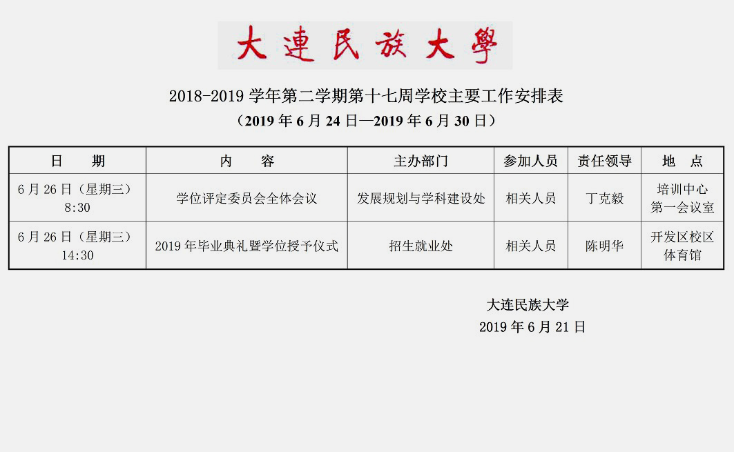 2018-2019学年第二学期第十七周学校主要工作安排表