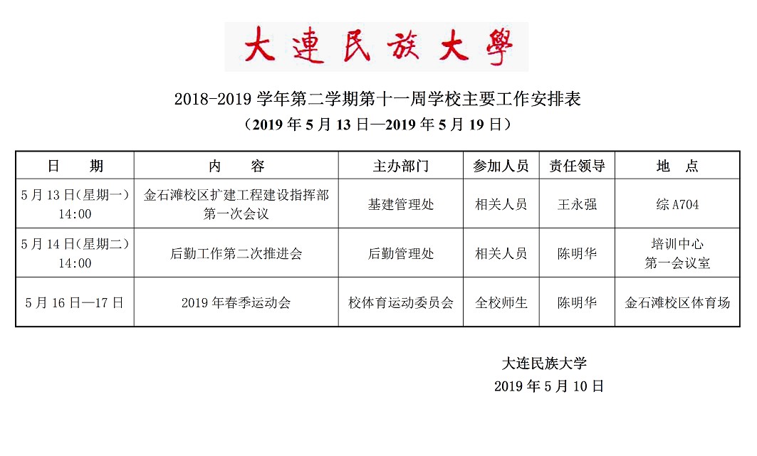 2018-2019学年第二学期第十一周学校主要工作安排表