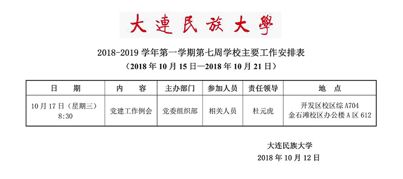 2018-2019学年第一学期第七周学校主要工作安排表