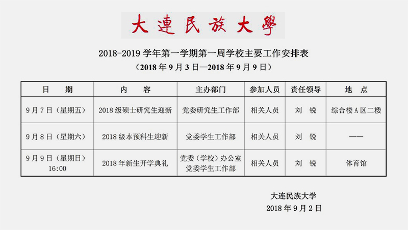 2018-2019学年第一学期第一周学校主要工作安排表
