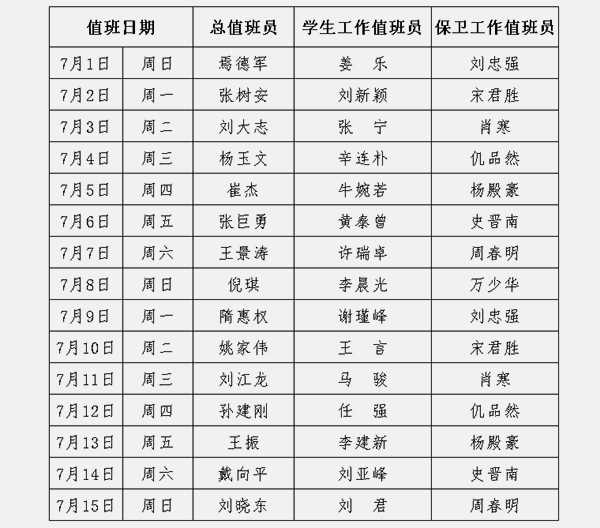 金石滩校区2018年7月份值班表