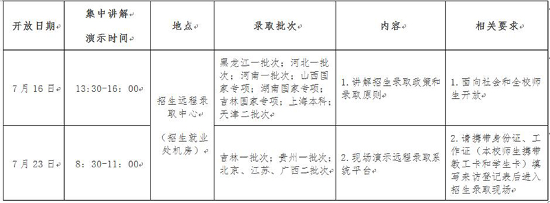为认真贯彻教育部关于深入实施高校招生阳光工程,认真落实招生信息“十公开”要求,使广大师生了解招生录取工作流程及录取办法,增加招生录取工作透明度,经学校本科生、预科生招生工作领导小组研究决定,在录取期间进行两次开放日活动,具体安排如下: