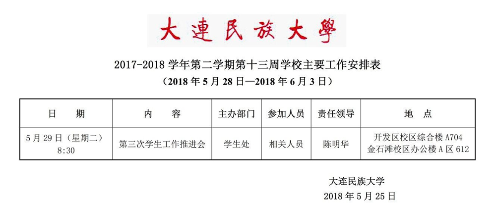 2017-2018学年第二学期第十三周学校主要工作安排表