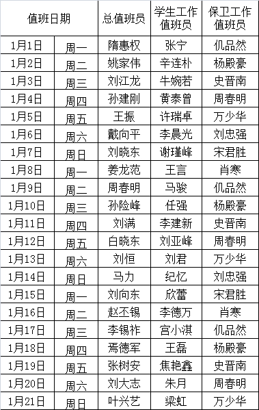 金石滩校区2018年1月份值班表