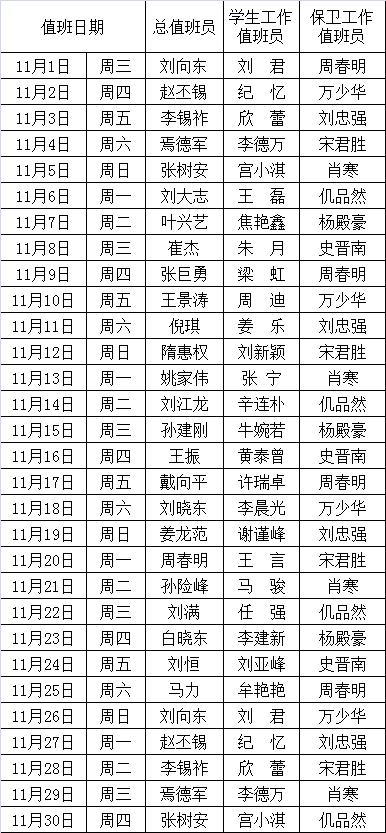 金石滩校区2017年11月份值班表