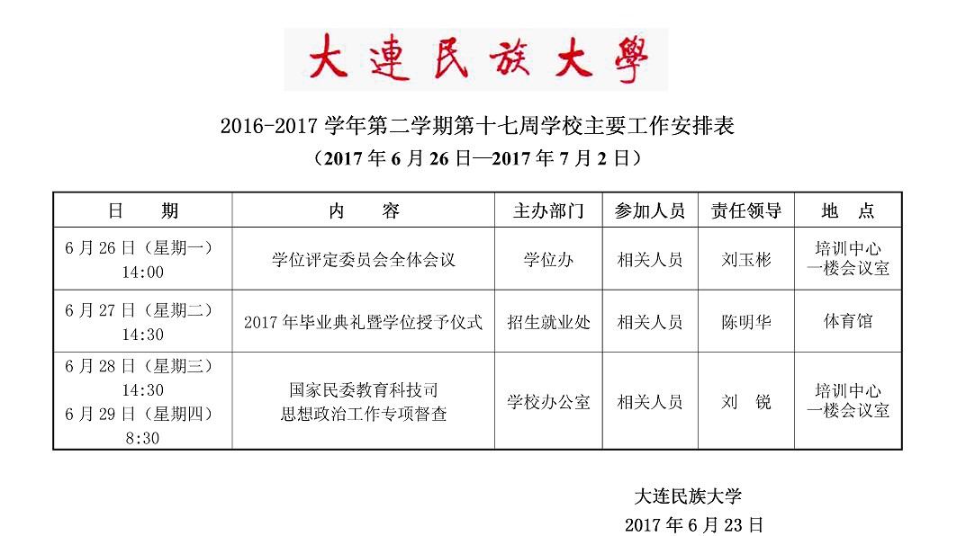 2016-2017学年第二学期第十七周学校主要工作安排表