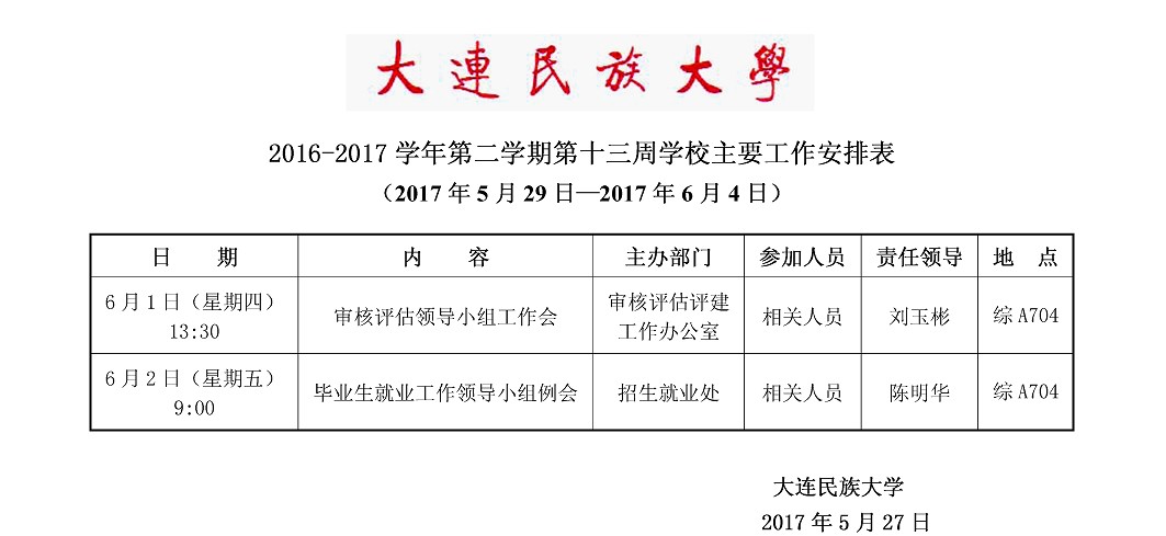 2016-2017学年第二学期第十三周学校主要工作安排表