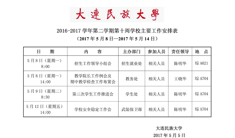 2016-2017学年第二学期第十周学校主要工作安排表