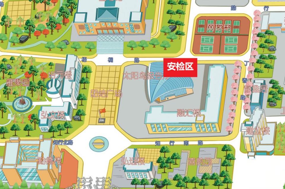 开发区校区考点在太阳鸟报告厅进行安检,由太阳鸟报告厅东南门(面向网球场一侧)进入报告厅(缓冲区)候场,由报告厅西门(面向融汇楼一侧)离开,按指定路线进入融汇楼各考场。