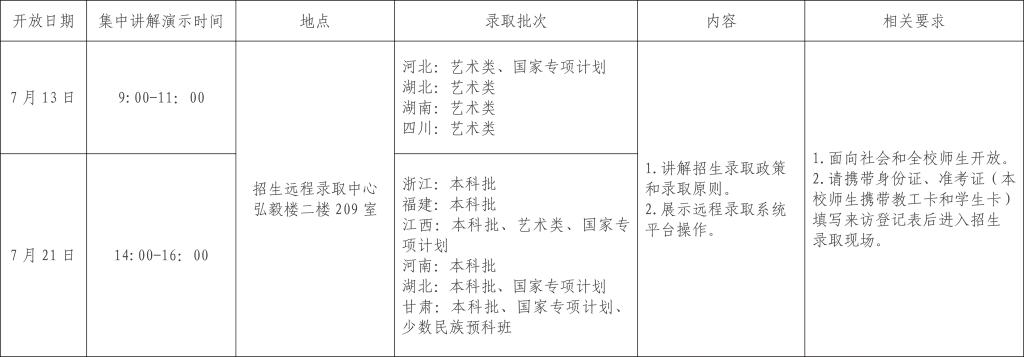 为认真贯彻教育部关于深入实施高校招生阳光工程,认真落实招生信息“十公开”要求,使广大师生了解招生录取工作流程及录取办法,增加招生录取工作透明度,经学校本、预科招生工作领导小组研究决定,在录取期间开展两次开放日活动,具体安排如下: